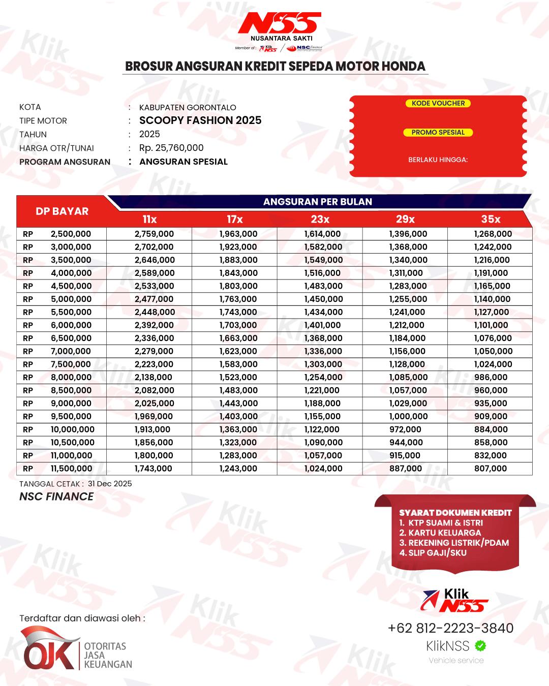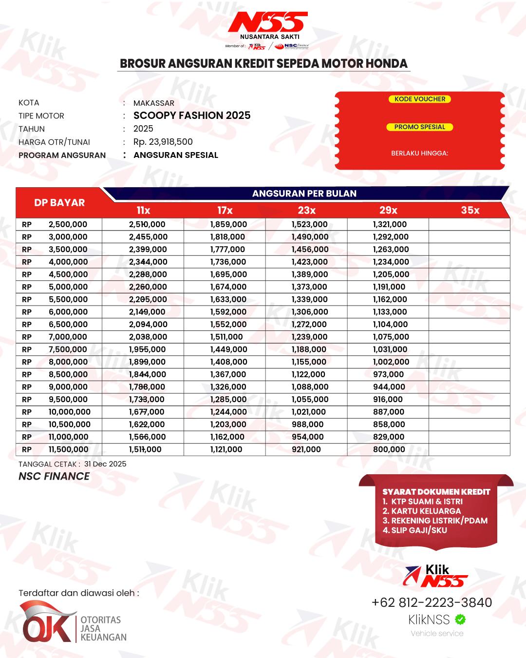 Kini Anda bisa mengajukan Scoopy Stylish Green dan Grey secara kredit dengan DP mulai 1,5 juta melalui Dealer Honda Nusantara Sakti terdekat di area wilayah Anda. Namun, untuk bisa kredit DP minim, salah satu syarat utama untuk DP minim adalah melampirkan foto KTP dan KK pemohon beserta penjamin.
